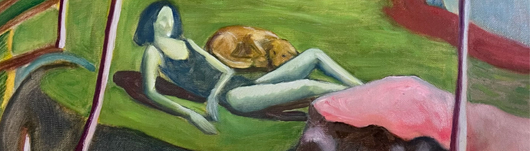 Exteriores en un color improbable reúne escenas donde lo familiar convive con lo enigmático, generando atmósferas oníricas que sugieren un mundo propio. Las figuras —mujer, perro, presencias sutiles, flores, montañas— se desplazan dentro de entornos que nunca son del todo estables. La serie se sitúa en ese borde entre lo reconocible y lo extraño, donde el mundo exterior adopta un color que no debería existir, pero existe.